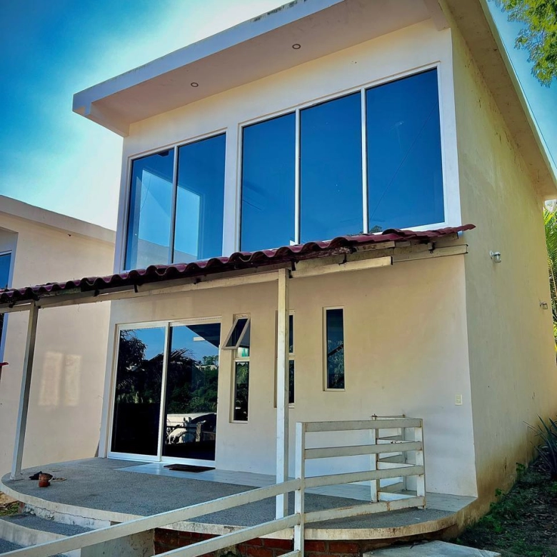 Each of the three independent units is designed for comfort and style. They feature full kitchens, spacious living areas, and private patios with jungle or village views. Every unit also includes air conditioning, independent water heaters, and artisan finishes that blend polished concrete, rich wood, and local craftsmanship. Shared amenities include an outdoor shower and laundry facilities, ensuring practicality without sacrificing charm.