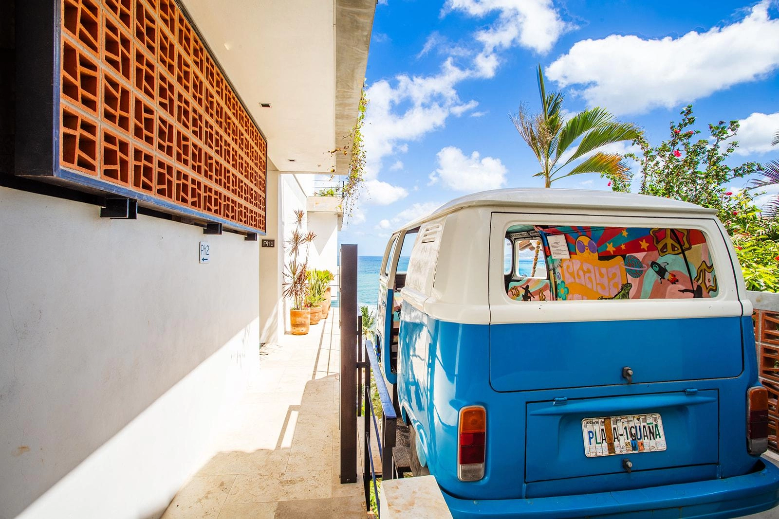 Residents enjoy a lounge deck, poolside kitchen, and access via a converted VW-van funicular or stairs, blending charm with modern convenience.