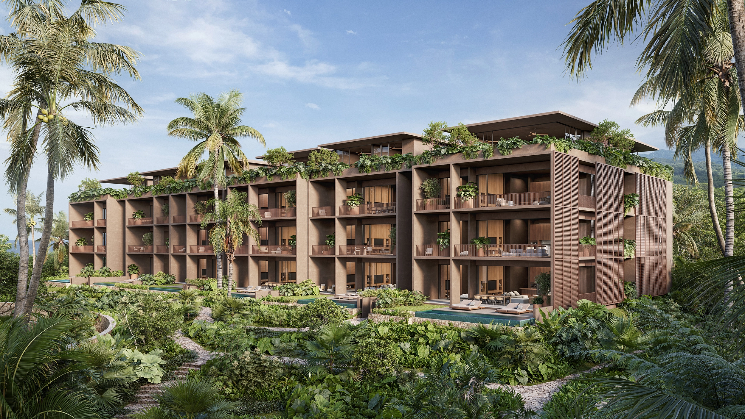 Stylish duplex-style residences offering garden patios or penthouse rooftop pools. Every bedroom opens to its own private terrace with Pacific views.