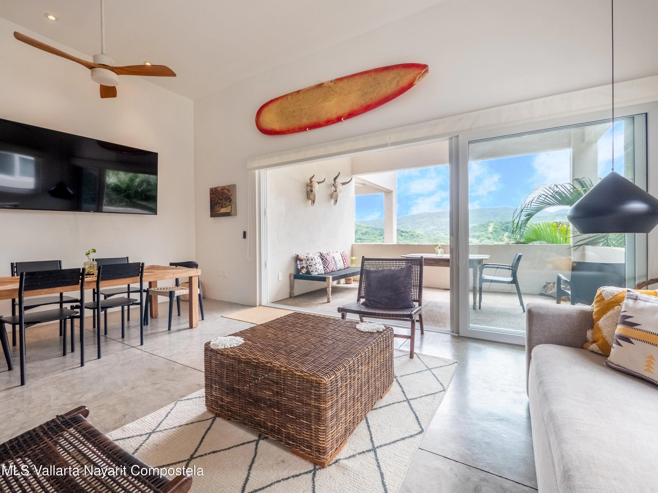 The kitchen and living areas flow directly into a private terrace with an outdoor dining and lounge space. From here, Vista Amanecer reveals panoramic views of Sayulita’s lush tropical mountains, offering an atmosphere of peace and sophistication.